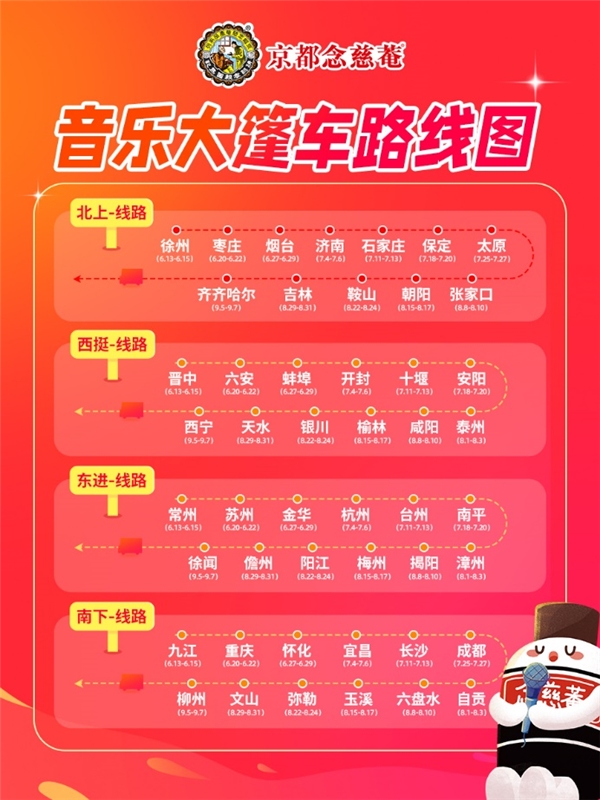 本次巡游规模空前,4条线路覆盖48城,携手全国超100家连锁药店,与各地市民共谱盛夏乐章。念慈菴音乐大篷车将带着音乐与健康的祝福,穿越祖国山川湖海,打卡特色地标,与更多市民朋友相遇。快来锁定你所在的城市一起来玩吧!