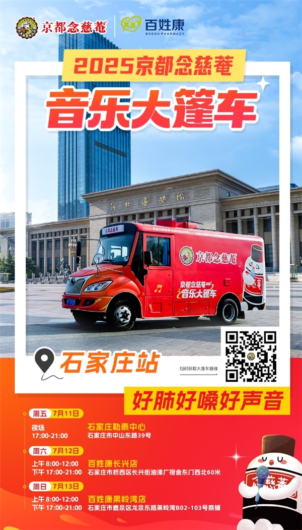 好肺好嗓好声音,2025念慈菴音乐大篷车着满载音乐与欢乐,继续在4条特色线路中前行,把念慈菴好声音唱响全国的每一个角落。2025年7月11日至13日,大篷车到站石家庄,为石家庄的市民朋友带来精彩纷呈的音乐演出,更带来护嗓养肺的全新体验。诚邀大家共赴这场视听与健康的盛宴!