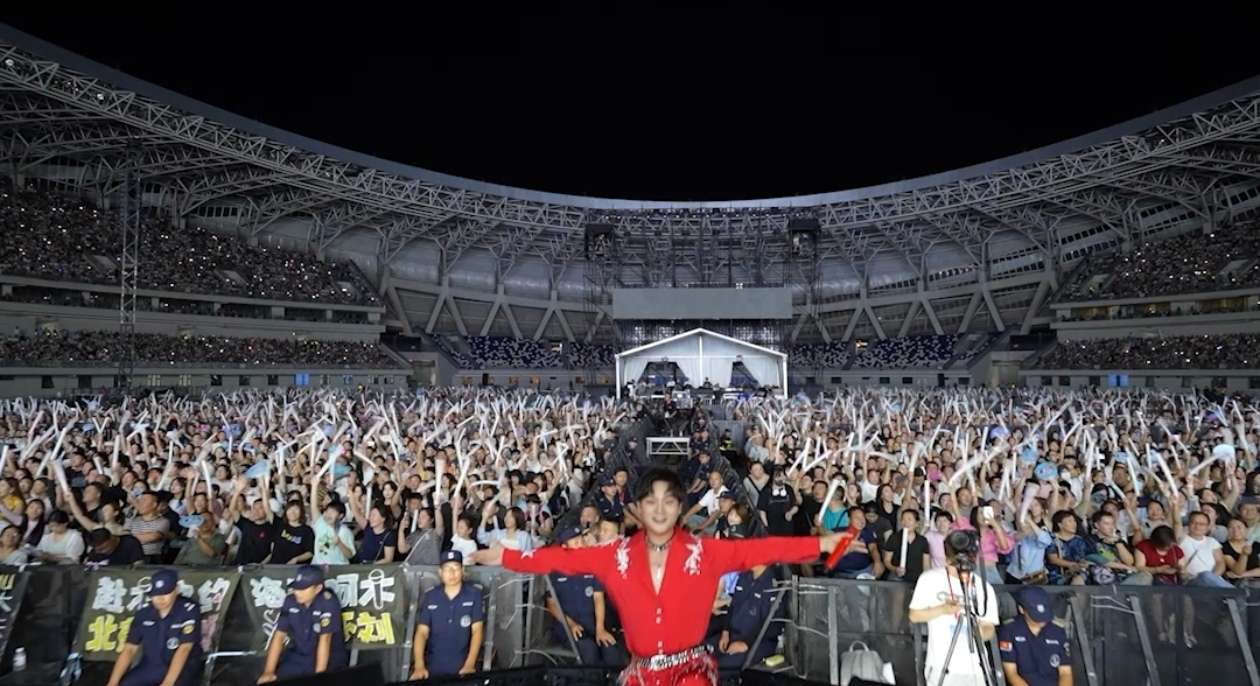 现场3万名观众纷纷打开手机闪光灯,整个体育场宛如一片璀璨的星河,大家跟着节奏齐声高歌,场面震撼人心。