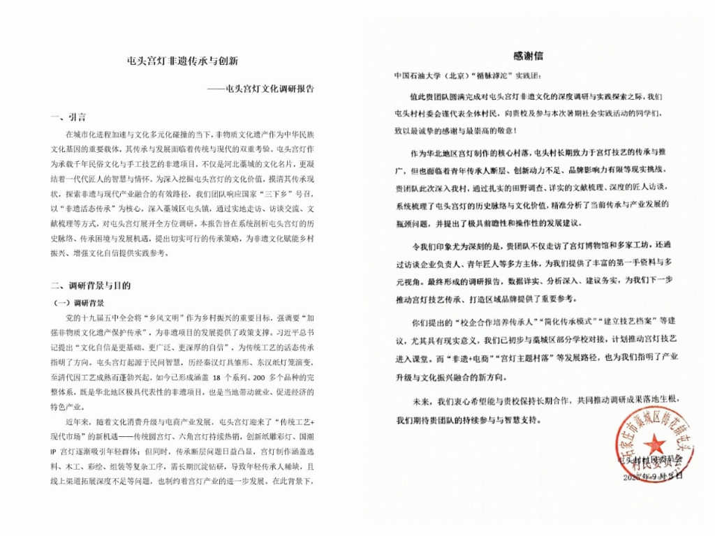 调研显示,屯头宫灯已开发18个系列200余品种,年产量超百万盏,电商渠道销售额占比逐年提升,但年轻传承人短缺、传统工艺创新难度大等问题仍然突出。实践团结合访谈与数据分析,形成《屯头宫灯非遗传承与创新调研报告》,提出校企合作、文创研发与数字化营销等具体方案。屯头村村委会特赠送感谢信,表达与高校持续合作推动非遗传承创新的期待。